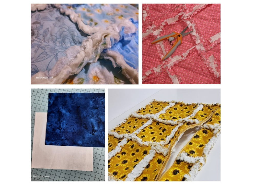 Handcrafted rag quilt pillow covers are made using two (three if more color is wanted on edge) layers of material; fabric top, fabric back (inside of pillow cover). Each contain an invisible zipper (teeth not showing) on back.