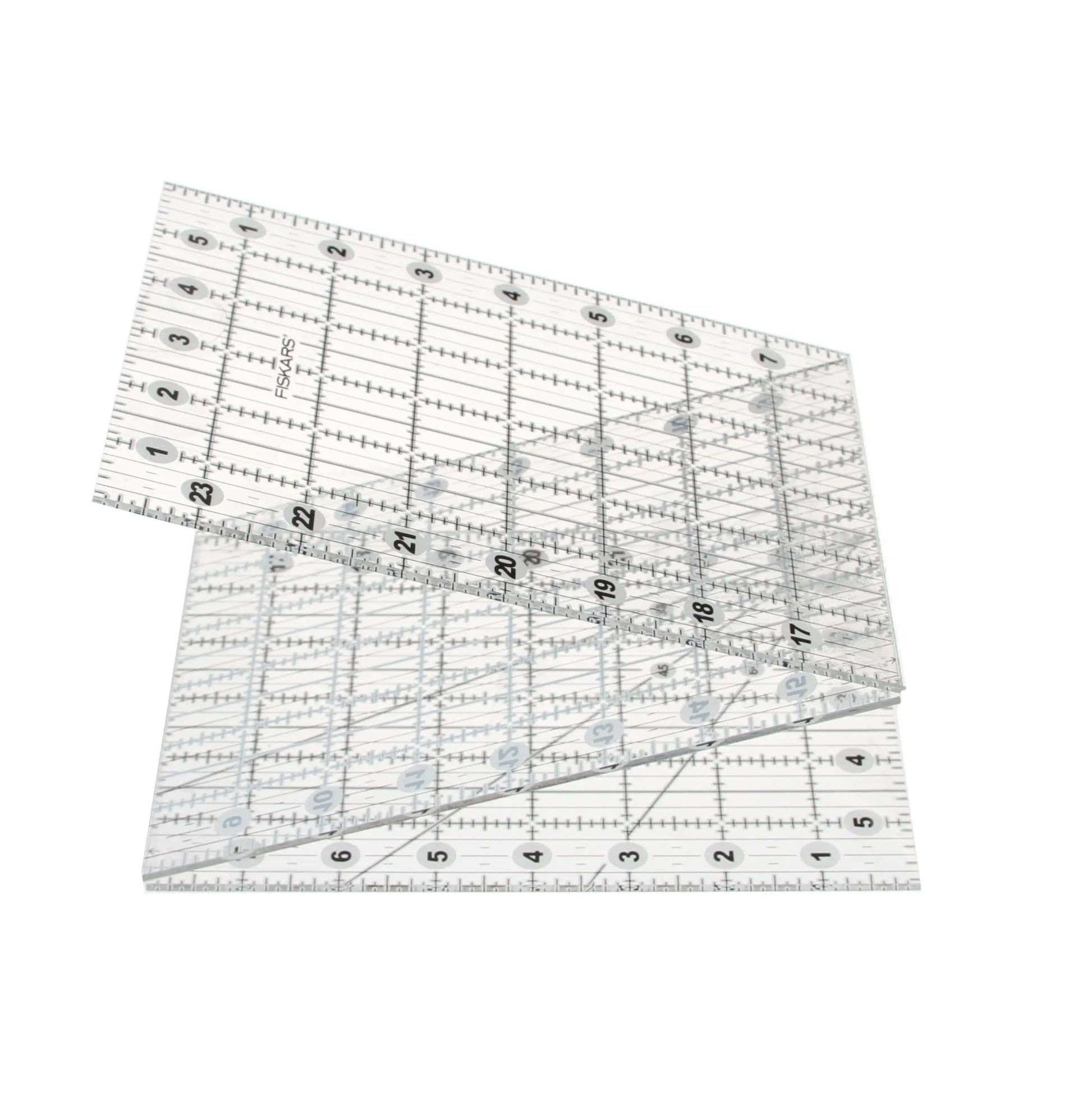 A 6in x 24in ruler folds to a third of its size for a portable measuring tool that allows you to make long cuts without the bulk of a regular ruler. A sturdy, convenient design makes it easy to cut fabric strips right from the bolt, while the ruler's folded 6in x 8in position is great for smaller cuts and storage. Clear, durable hinges allow the ruler to lie perfectly flat for smooth cuts without catching or snagging. Lines feature clear intersections and two tones for improved visibility on light, dark and patterned fabrics. Plus, 30-, 45- and 60-degree angle lines simplify angle cutting.